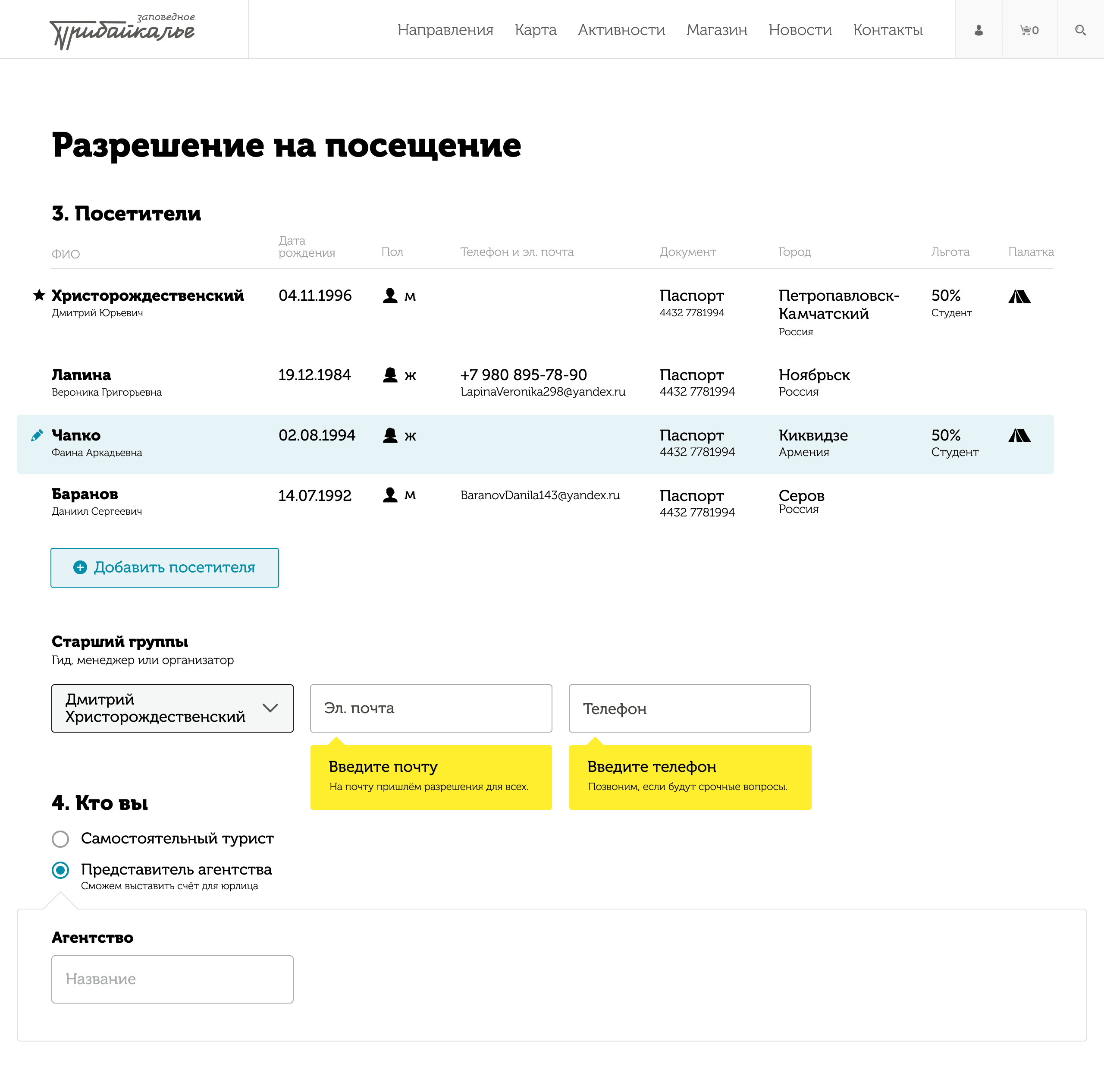- 2. Enter details for all group members. Discounts are available for students and Irkutsk Oblast residents. Don’t forget to bring your IDs.