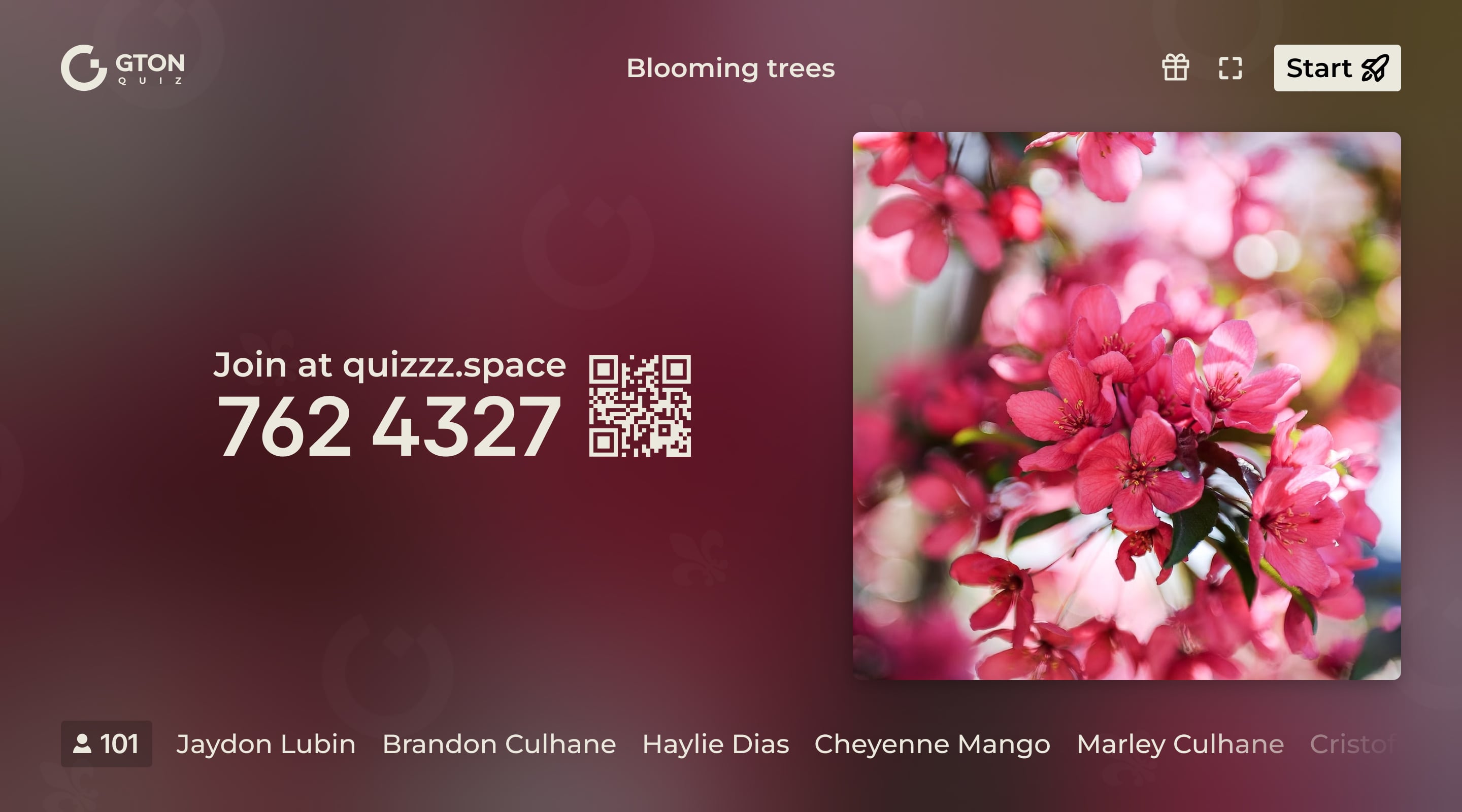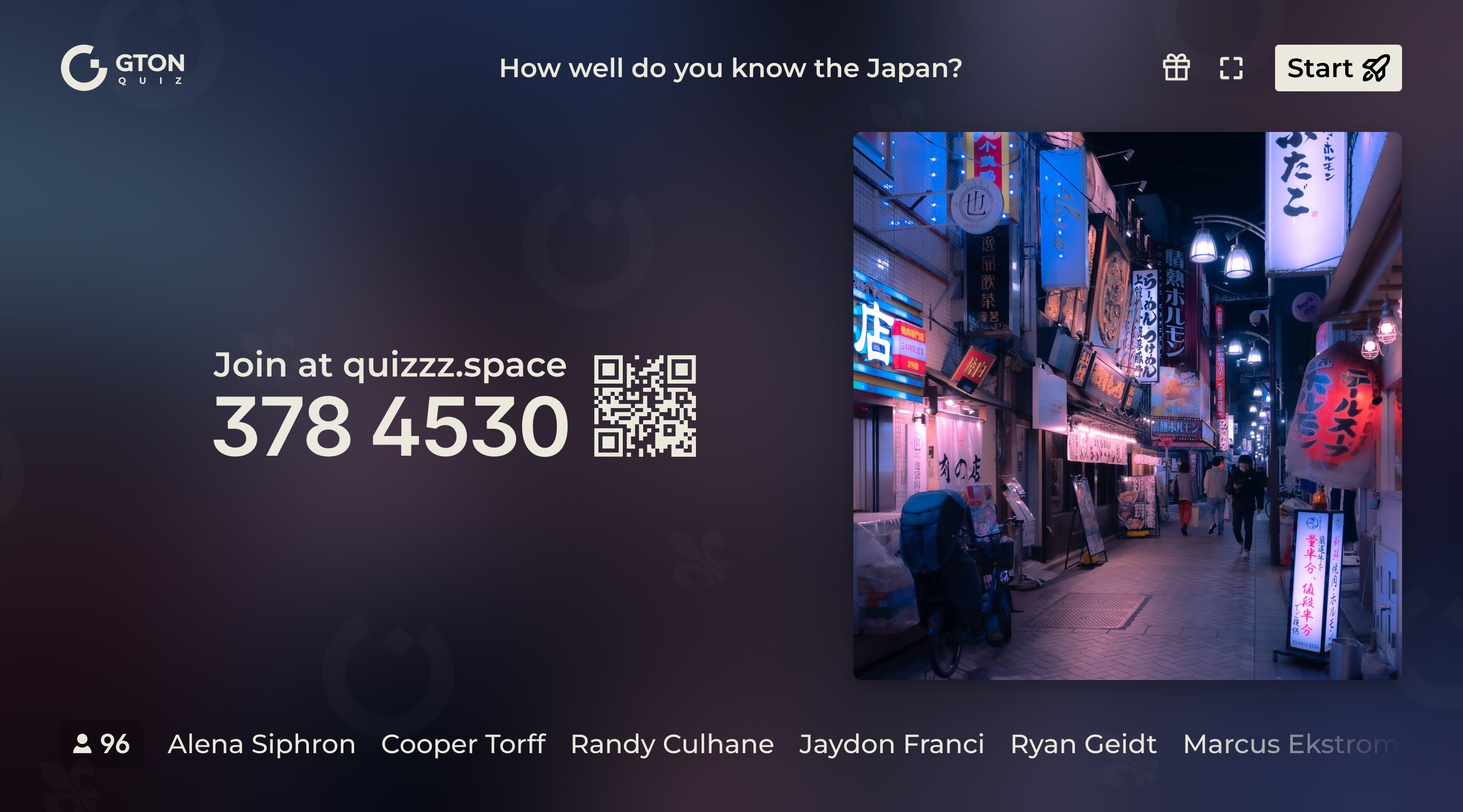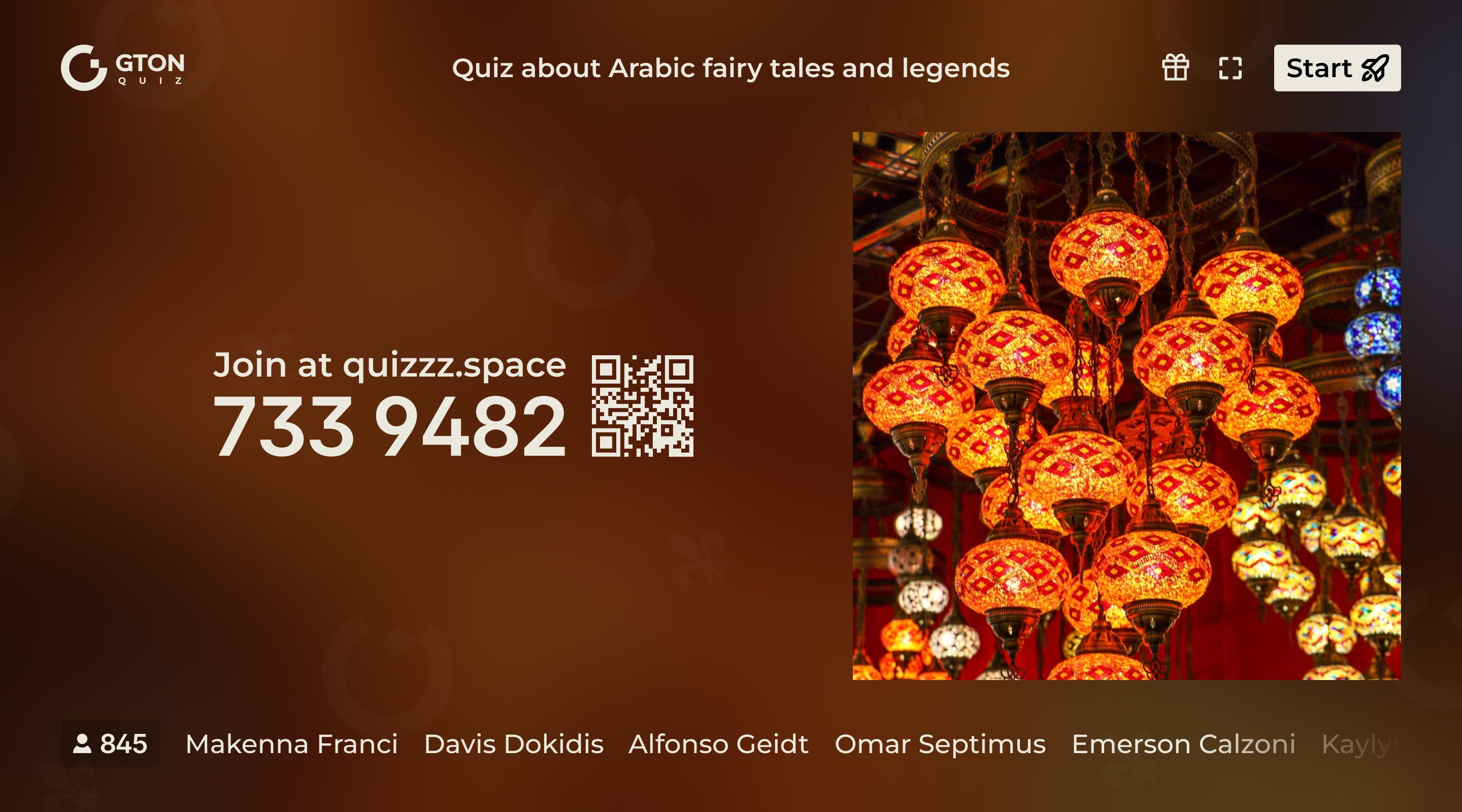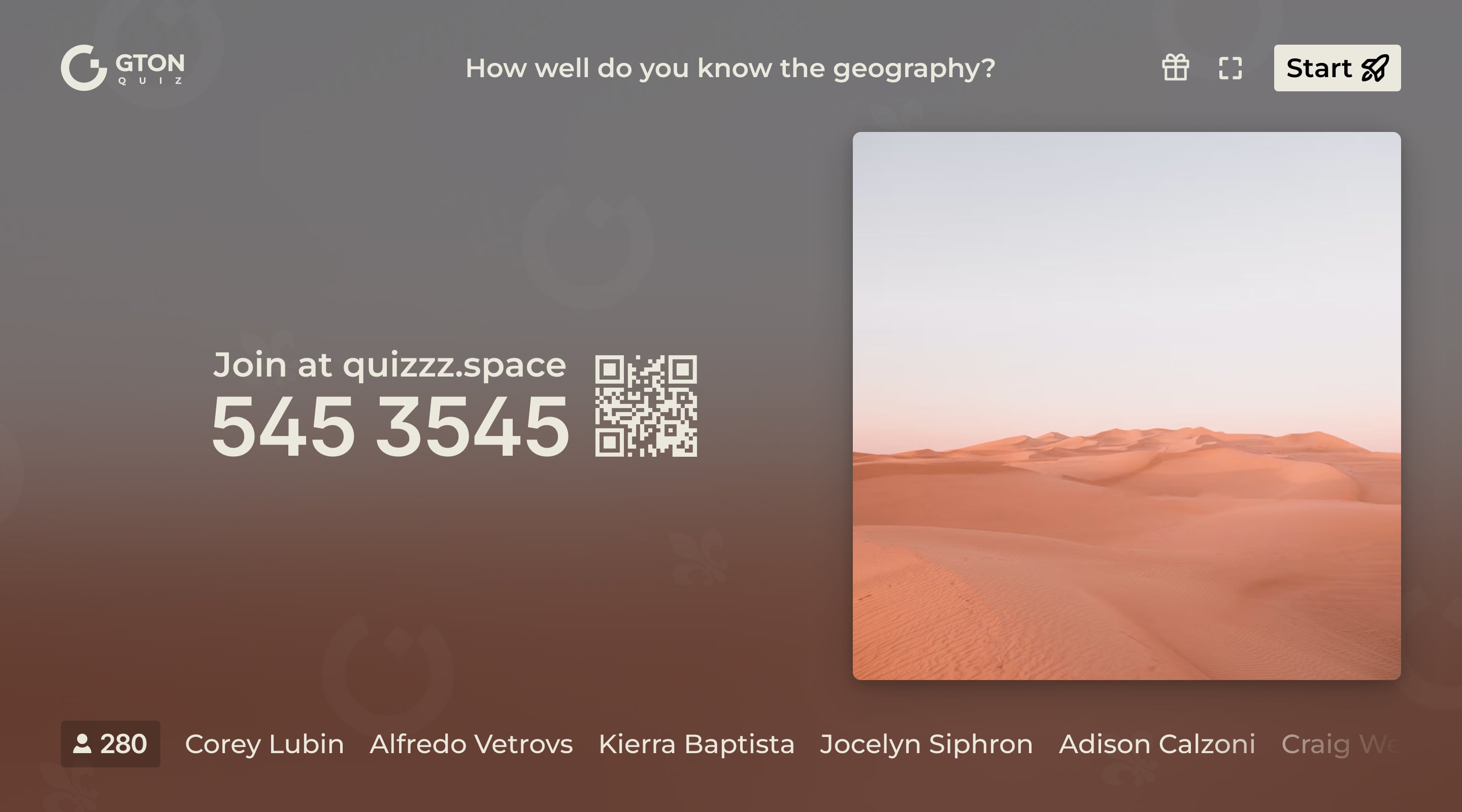 The host starts the quiz and shares their screen. Players scan the QR code and see their names appear on the list of participants.