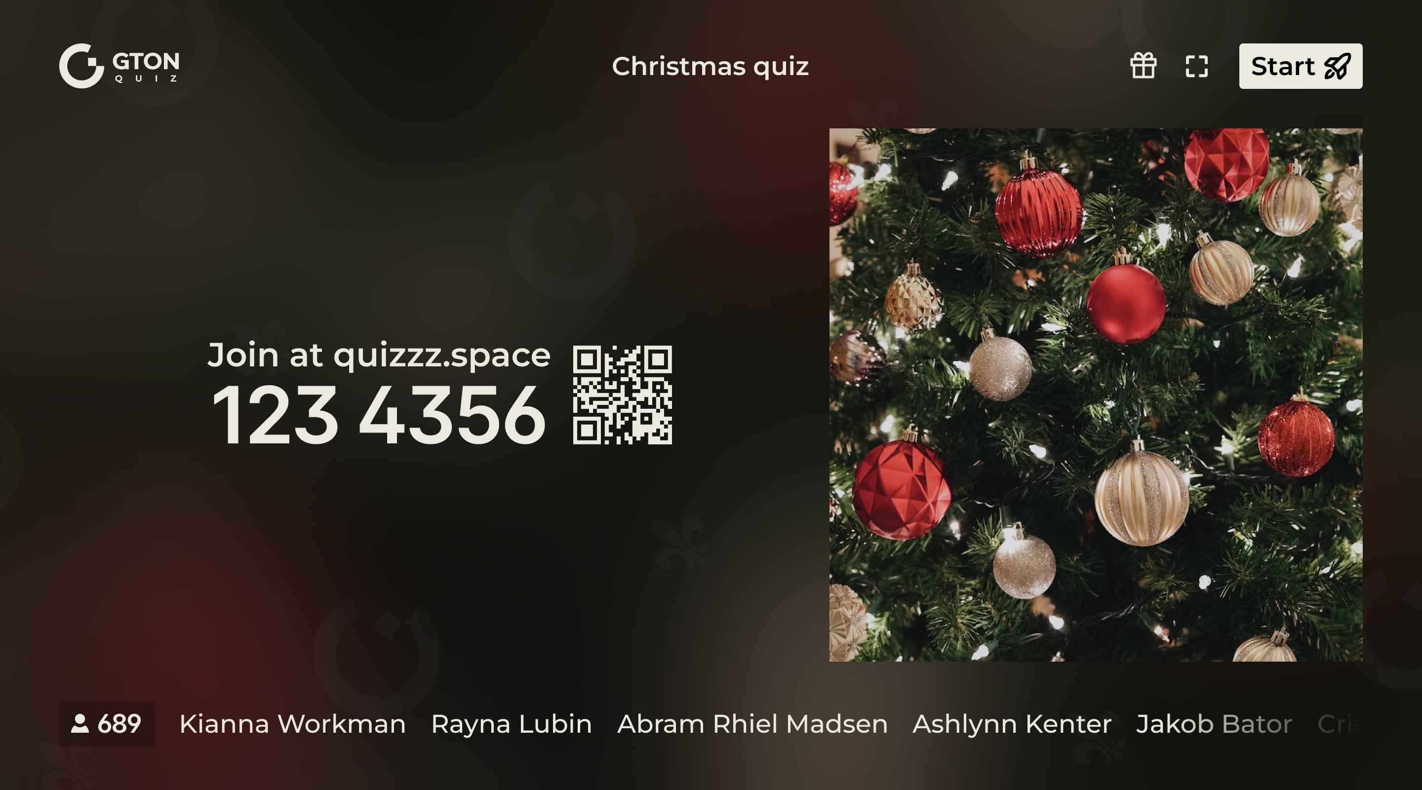 The host starts the quiz and shares their screen. Players scan the QR code and see their names in the list of participants.