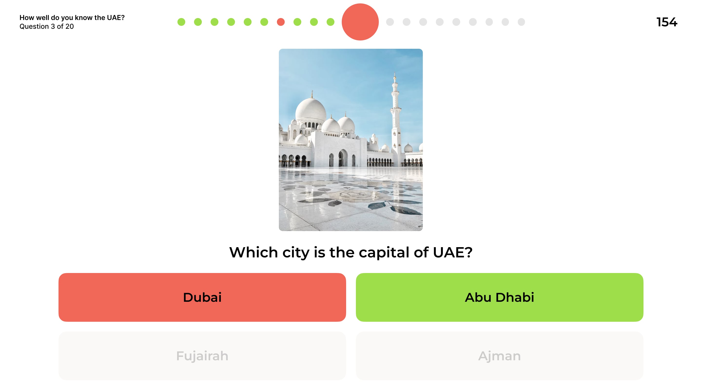 The player answers the question and then sees the correct answer. The timer circle changes colour depending on whether the answer is correct or not, turning green for correct and red for incorrect.