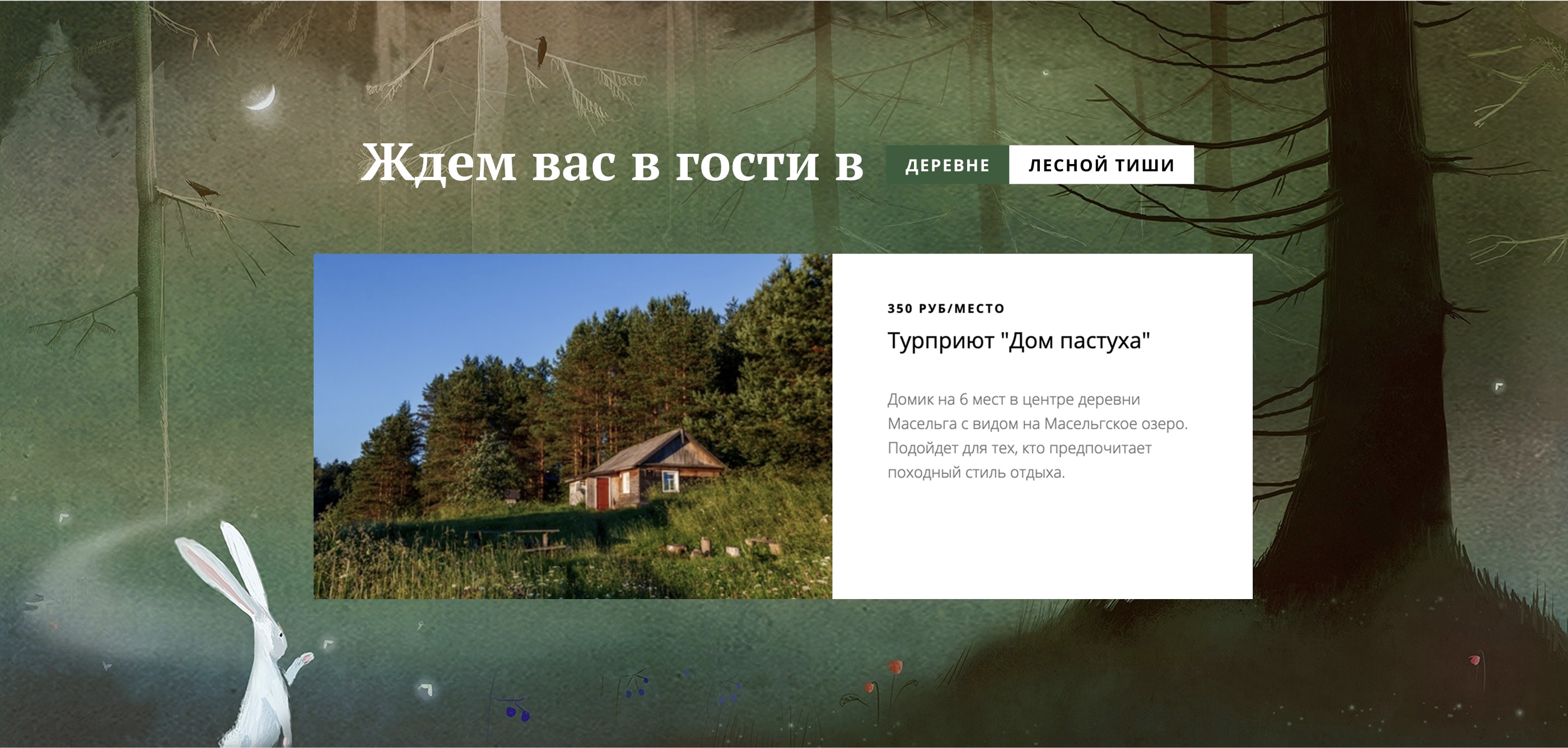 The main page features a section about the houses. Visitors can browse options and choose what suits them best — a village setting or the quiet of the forest.