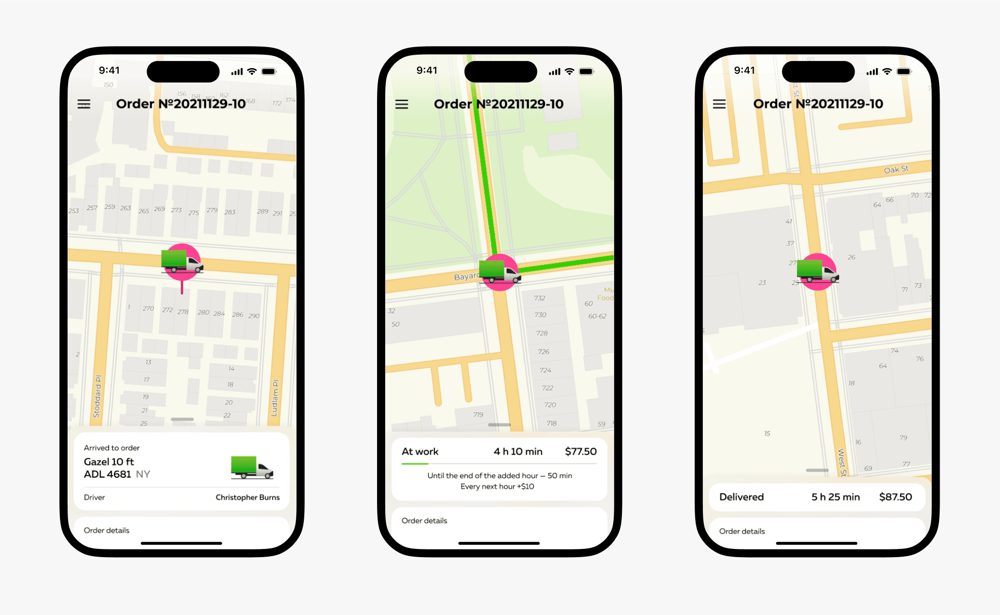 If the scheduled time isn’t enough, the order is extended by an hour and the total cost is recalculated. The order progress bar turns pink, and the customer receives a push notification about the change.