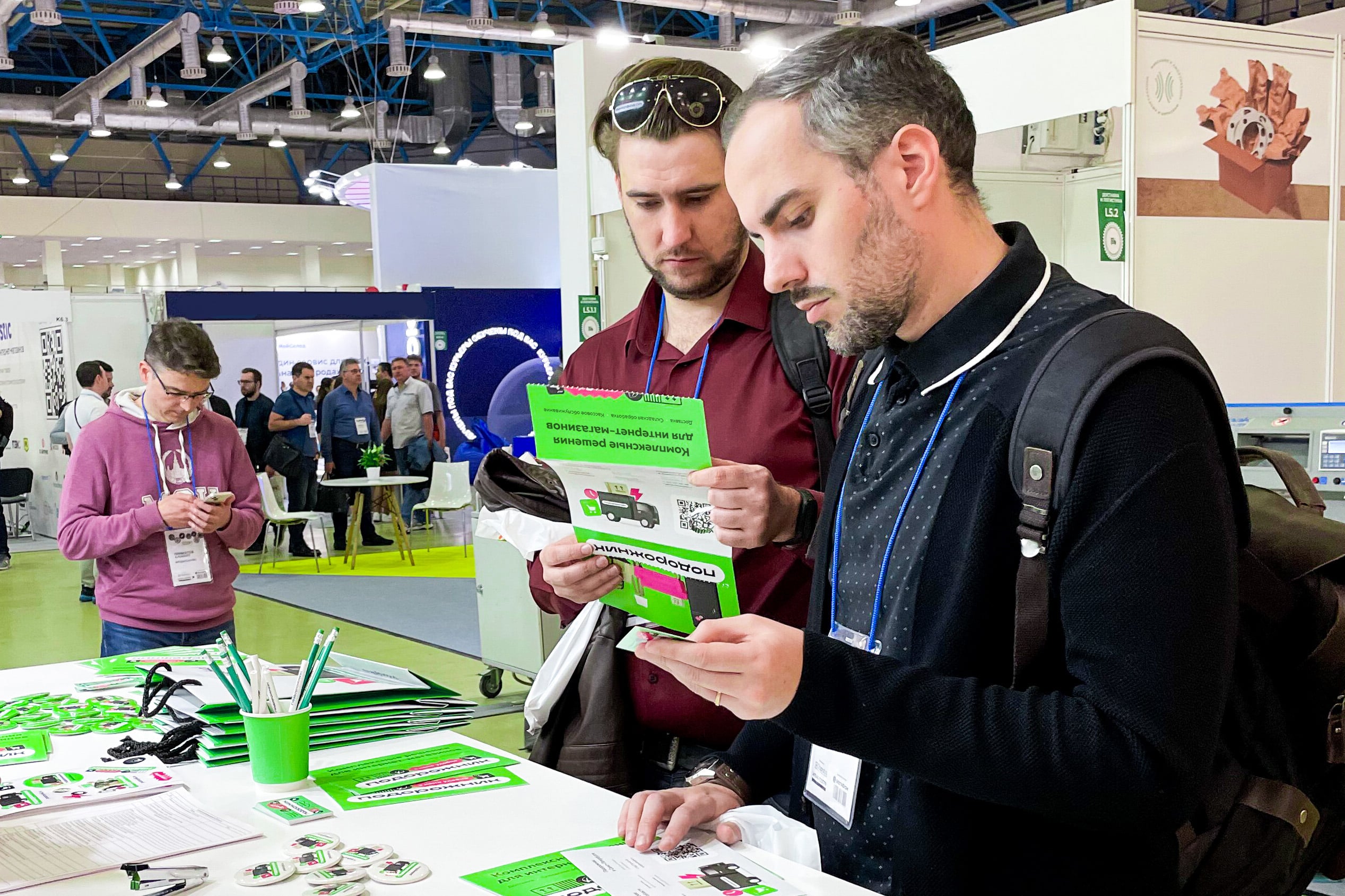 At the exhibition, Podorojnik consultants wore black polo shirts. This made them booth out against the green background of the booth.