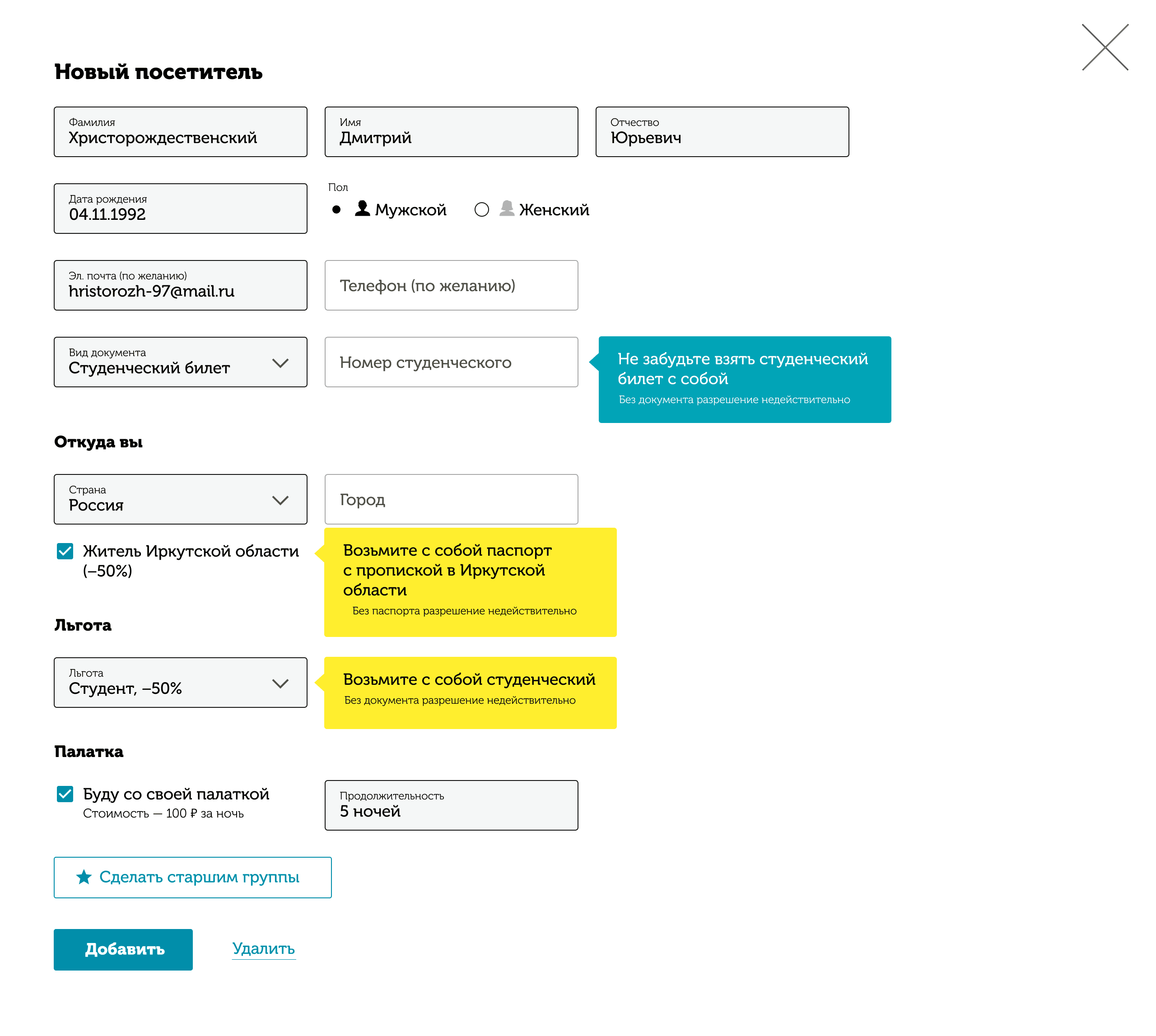 2. Enter details for all group members. Discounts are available for students and Irkutsk Oblast residents. Don’t forget to bring your IDs.