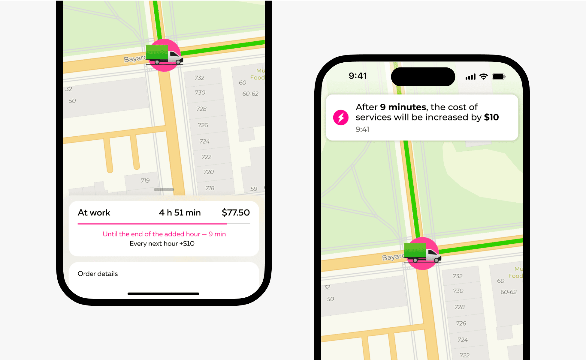 If the scheduled time isn’t enough, the order is extended by an hour and the total cost is recalculated. The order progress bar turns pink, and the customer receives a push notification about the change.